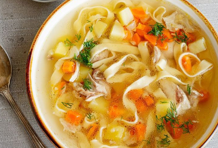 вкусный бульон из курицы, с лапшой, с картофелем и подаётся с сырным тостом