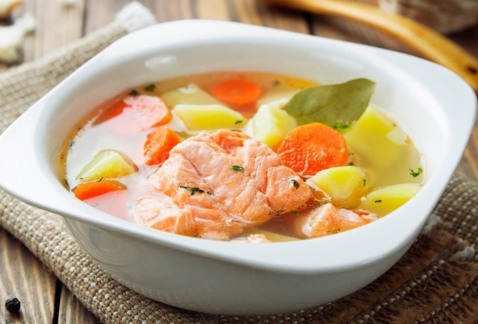 Душистая уха из двух видов рыбы, подаётся со стопкой водки