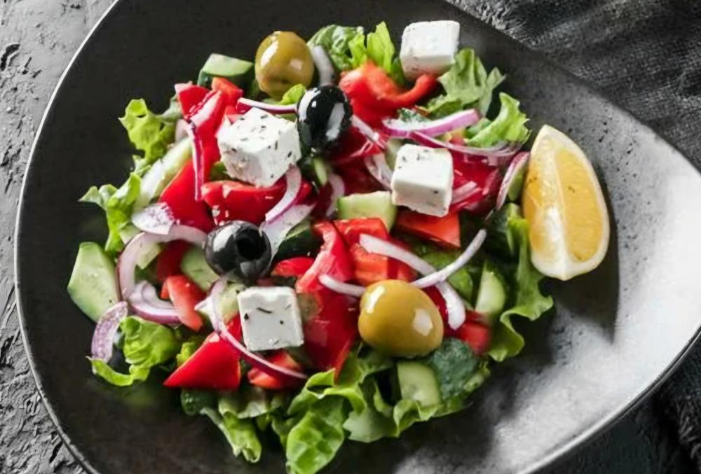 микс из свежих овощей, маслин, сливочного сыра, зелени и сладкого лука под фирменной заправкой