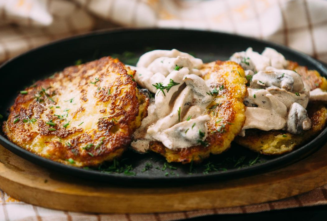 Запечённый картофель, свежий огурец, свиная вырезка, сыр, фирменный соус