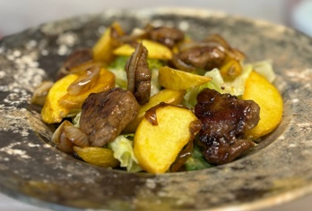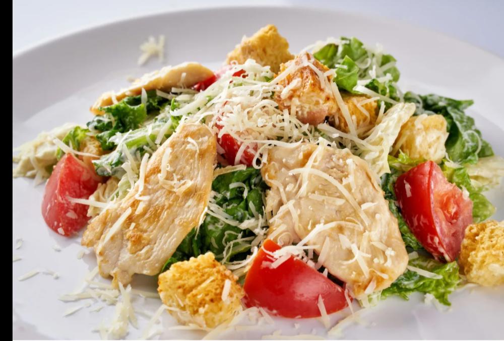Салат романо, черри, курица, пармезан, сухарики, подаётся с фирменной заправкой