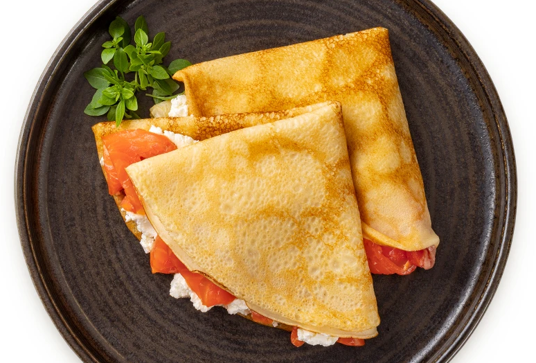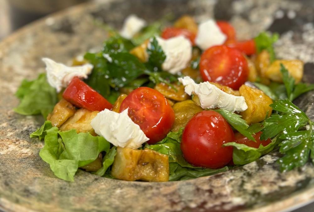 Баклажаны, твороженный сыр, сладкие томаты, зелень, сладко-острая заправка