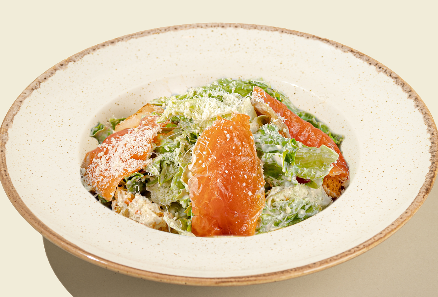 Салат романо, черри, лосось м/с, пармезан, сухарики, подаётся с фирменной заправкой