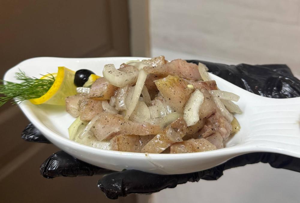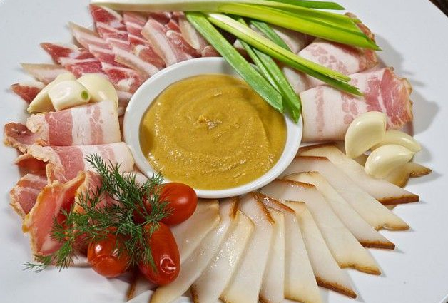 Тонкие ломтики сала, подаются с горчицей, хреном и зеленью
