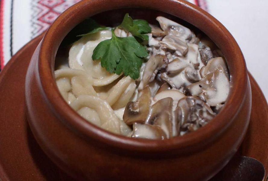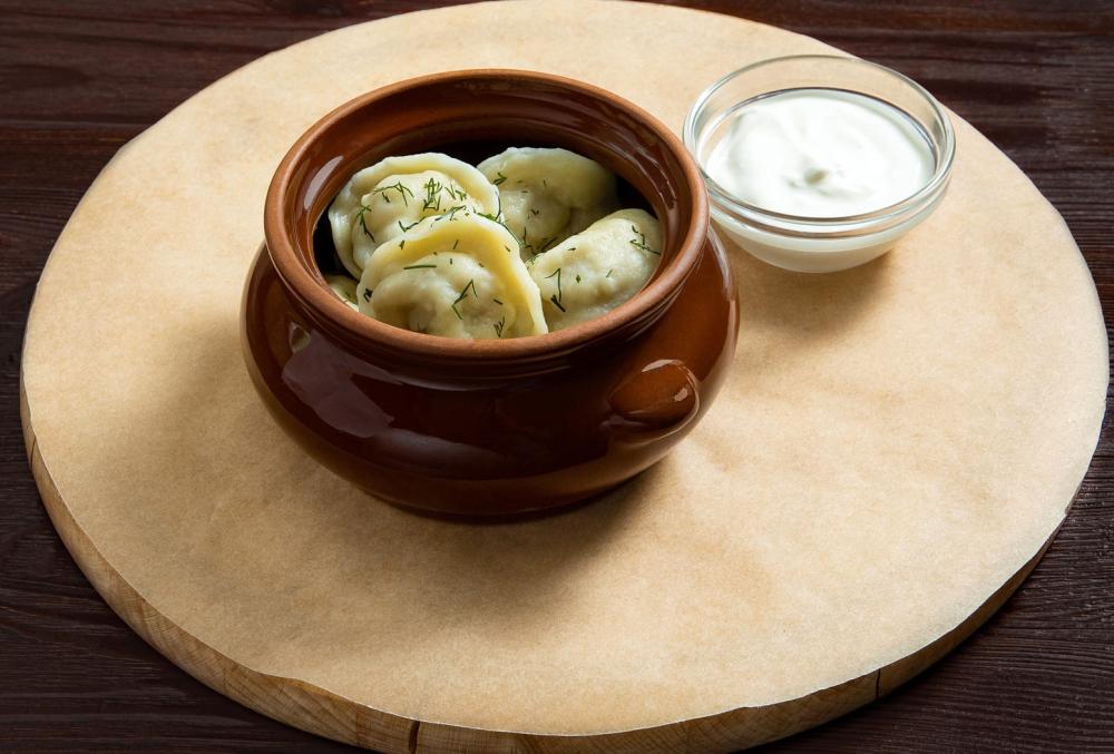 Классические пельмени из говядины и свинины, подаются с бульоном, с добавлением печени, пассерованной с грибами, морковью и луком