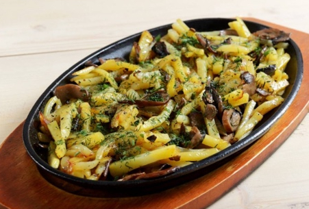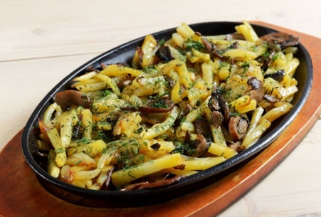 Классический жареный картофель с лучком и лесными грибами, подается на горячей сковороде.