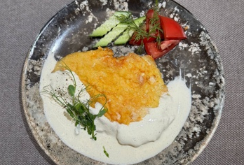 сочное филе курицы в сырной корочке, гарнируется свежими овощами и сливочным соусом