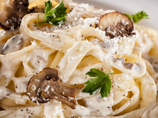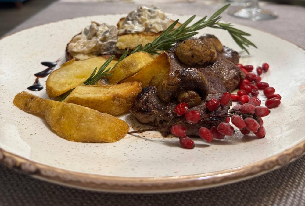Обжаренная мякоть фермерской телятины, подаются с грибным жульеном и обжаренным картофелем.