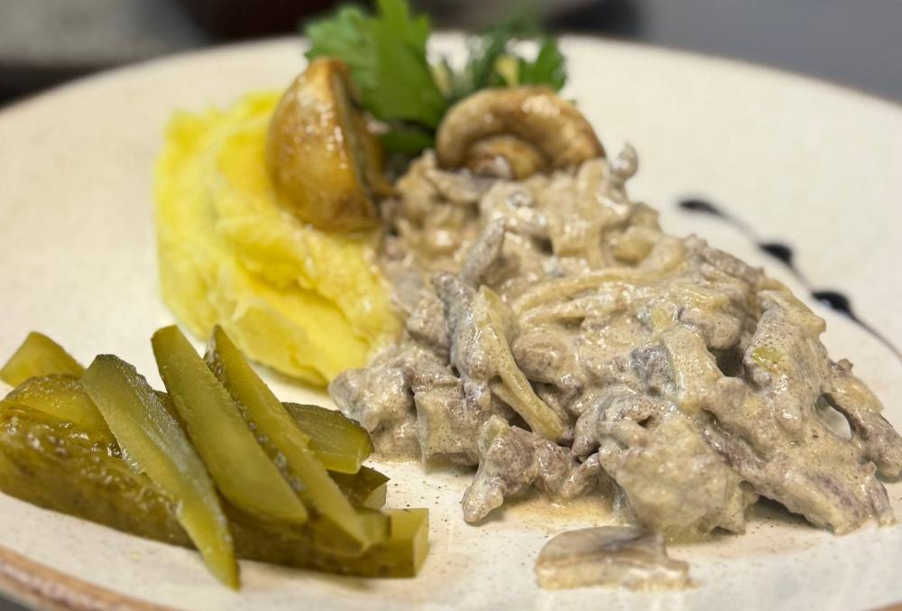вырезка из фирменной говядины в сливочном соусе с грибами, подаётся с картофельным пюре и корнишоном