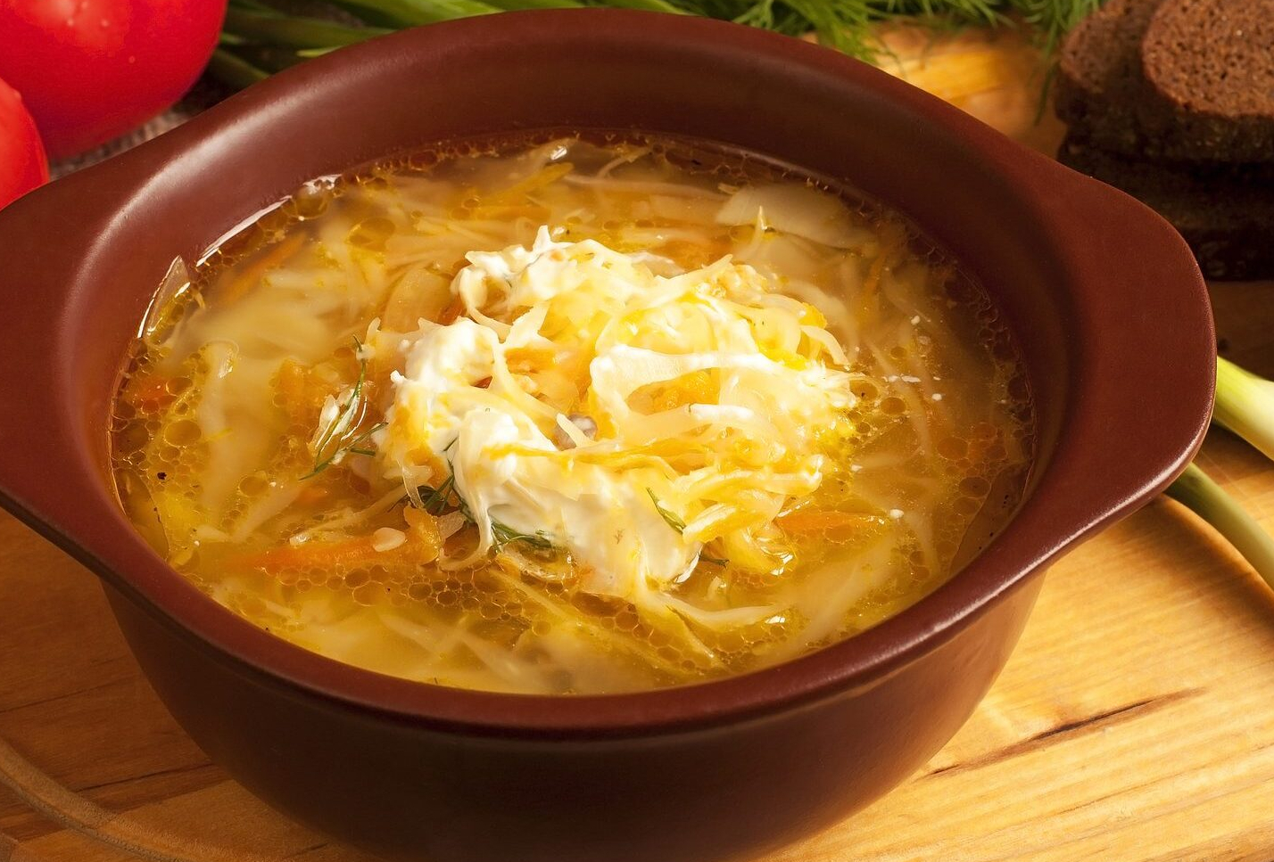 наваристый суп на свином бульоне, подаётся с домашней сметаной, зеленью и тостом черного хлеба.